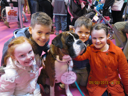 Usually we are very busy on the stand at Discover Dogs and probably talk to hundreds of people over the course of the four days. It is always a surprise to us when people come back, having visited us the previous year, and remember the names of our dogs!! With so many people having camera phones the dogs get photographed many times each day, especially by young people, and we in turn are frequently shown photographs of their boxers at home. What is particularly rewarding about this event is the opportunity to help people who are thinking of getting a dog, but are not sure what breed, to decide whether a boxer would be the right breed for them.It also always amazes us how well the dogs respond to a day of close attention from strangers, somehow they seem to understand that their job is to greet everybody and to lick any faces that get close enough to lick. They also respond brilliantly to small children and toddlers. Pictured here with a group of young admirers is Rita and Henry Clarke's 'Misty' - Sarsbrook Fashionista, 1 RCC (Ch Manic Gok Wan ex Walkon Cover Girl for Sarsbrook, d.o.b. 24.02.2010). |